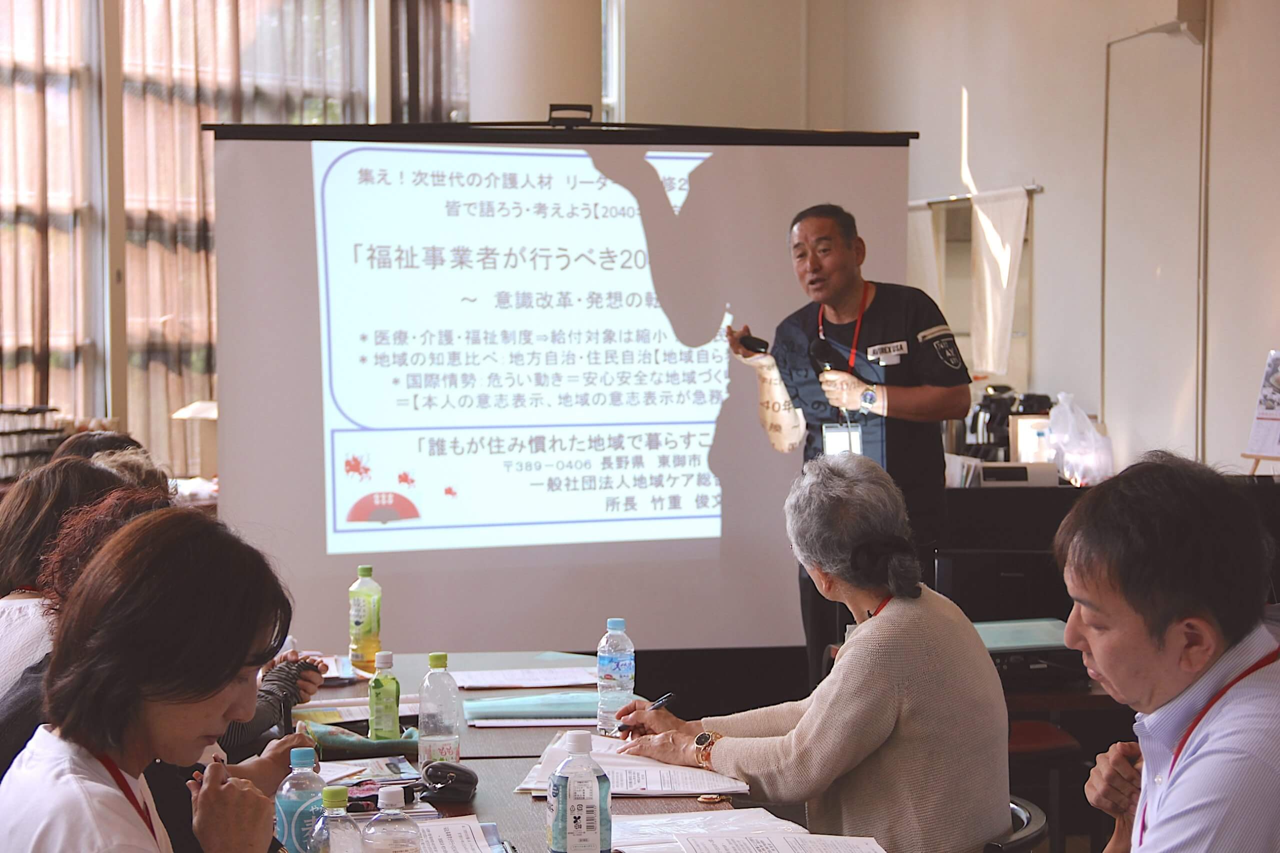 続いては、経営者寺子屋1。「福祉事業者が行うべき2040年への備え」について、一般社団法人地域ケア総合研究所 竹重俊文(市民協理事)による特別授業が行われました。