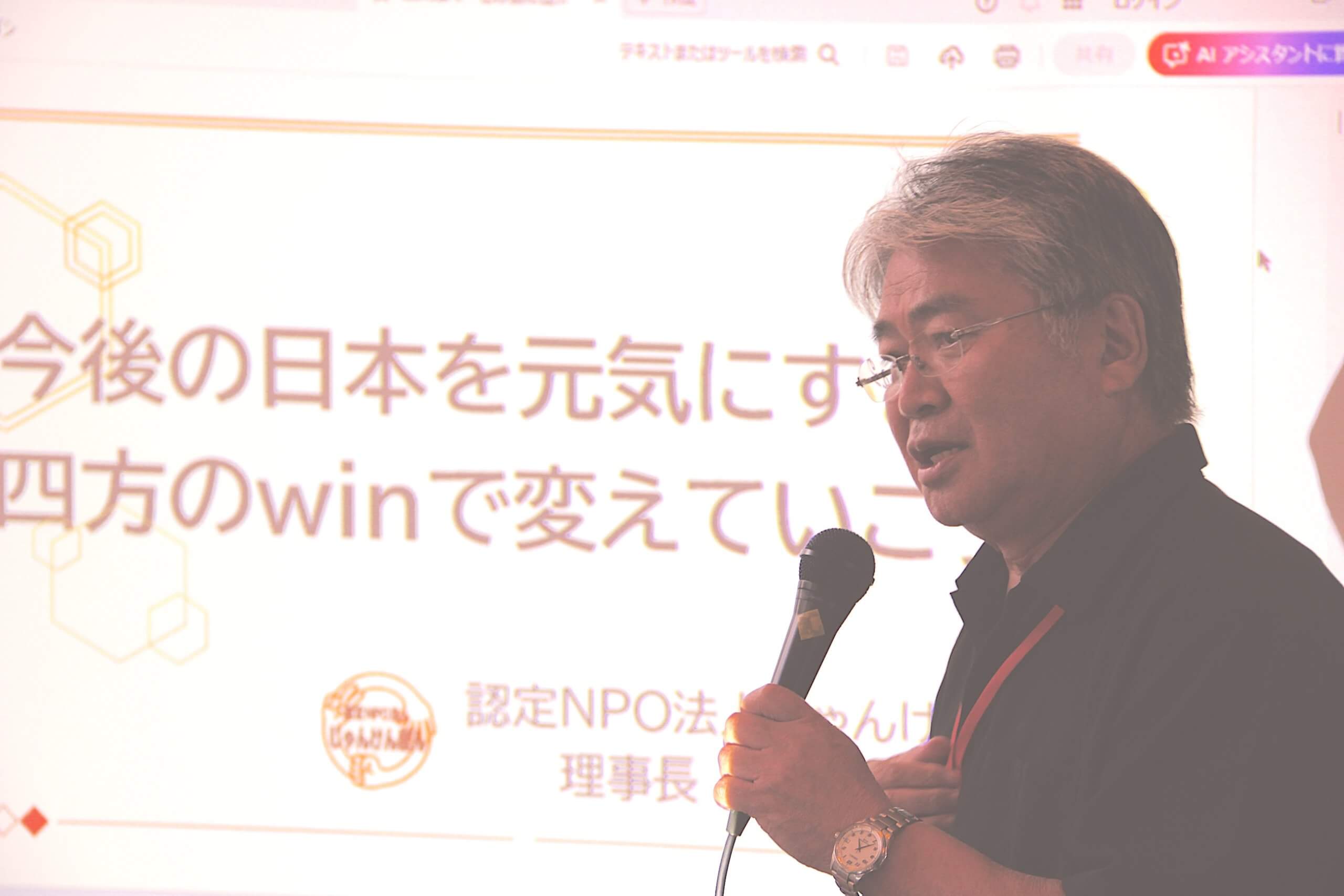 市民協主催リーダーズ研修2025。続いては、経営者寺子屋2。「今後の日本を元気にする四方のwinで変えていこう」について、認定NPO法人じゃんけんぽん 井上謙一講師(市民協理事)による参加者への提案と問いかけが始まりました。