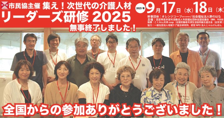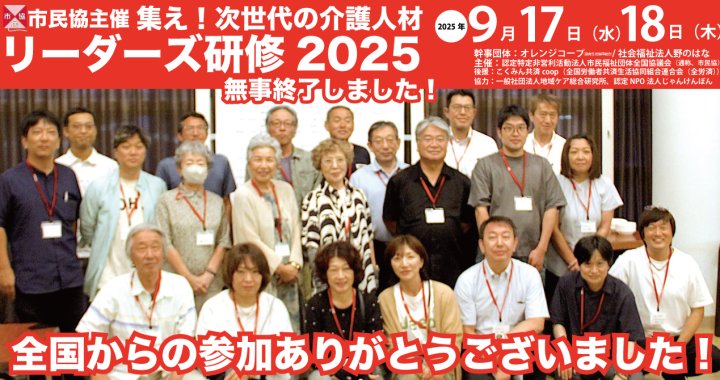【2日目終了】リーダーズ研修2025in大阪。オレンジコープ・・・ 掲載日:2025年9月25日9:00 AM 分類:市民協からのお知らせ, 会員からのお知らせ 介護系事業者900団体の会員を有し、身近な地域での助け合い・支え合い、 優しい福祉のある地域社会づくりを推進している認定特定非営利活動法人市民福祉団体全国協議会 (本社:東京都新宿区、代表理事:鷲尾公子・とよしま亮介、略 […] 続きを読む→