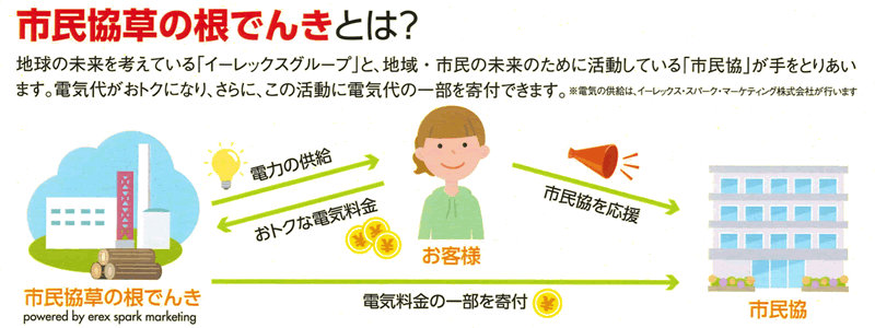 「 市民協草の根でんき 」とは、地球の未来を考えている新電力の「 イーレックスグループ 」と、市民の未来のために活動している「 市民協 」が手をとりあい実現することになりました。